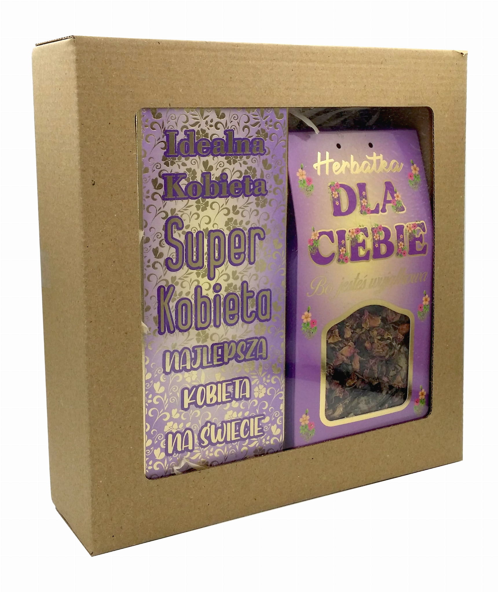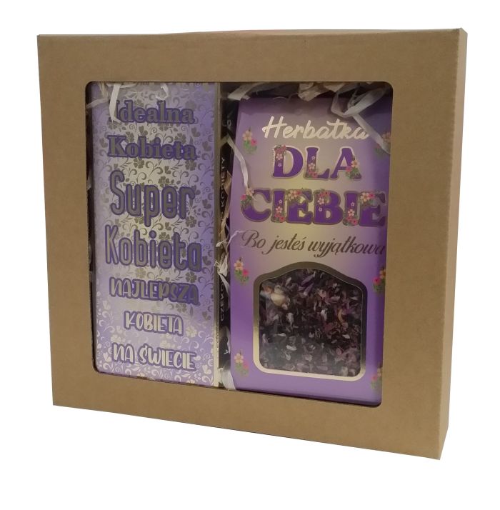 Herbata + Czekolada. Wszystko zapakowane w eco kartonik wypełniony siankiem , całość zamknięta przykrywką z okienkiem.