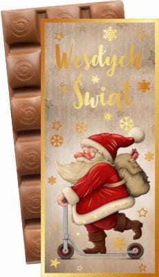 Może pięknego złoconego opakowania? Tak, nasza czekolada właśnie takie posiada, sztywny, gruby kartonik ze złoceniami i wyjątkową grafiką przygotowaną na każdą okazję.