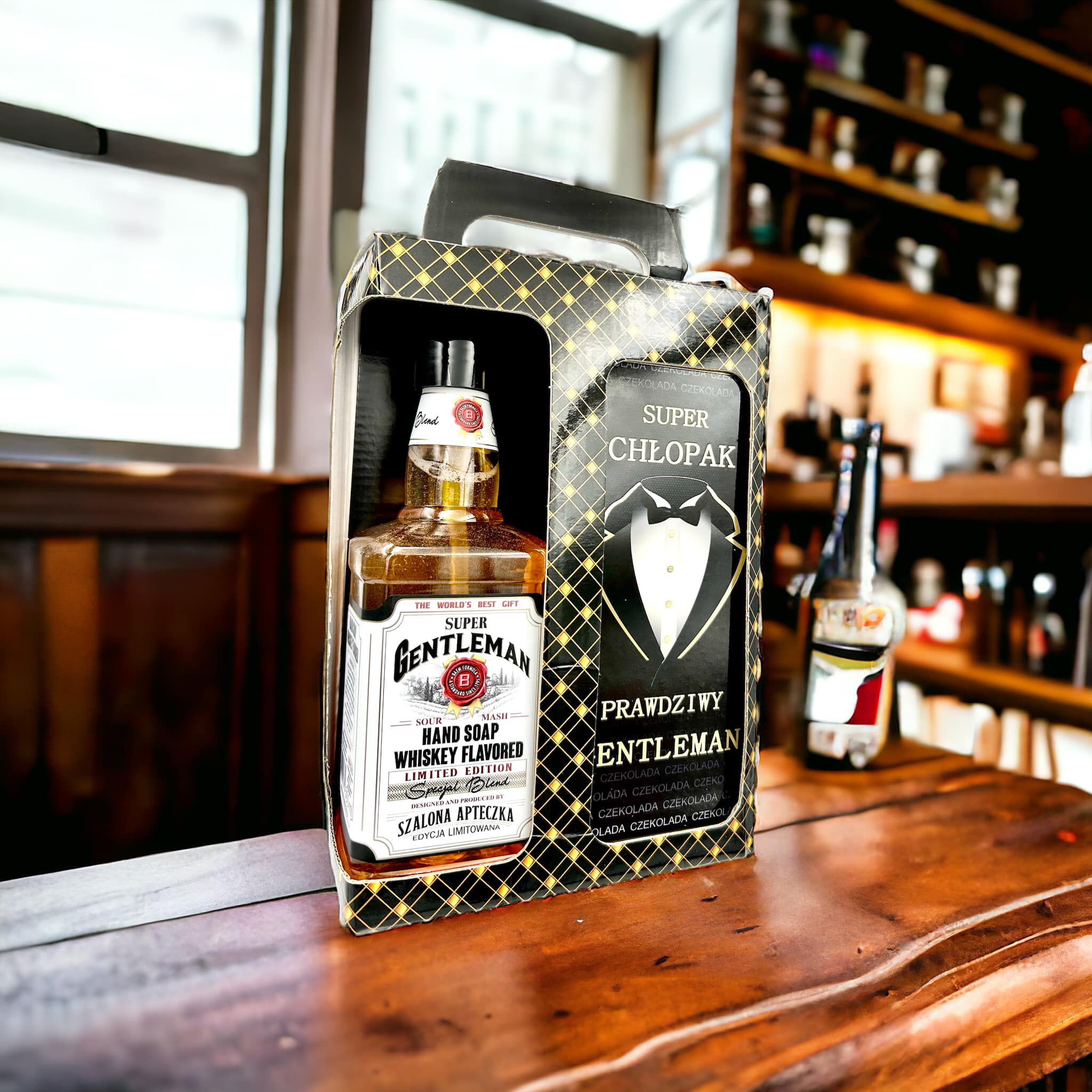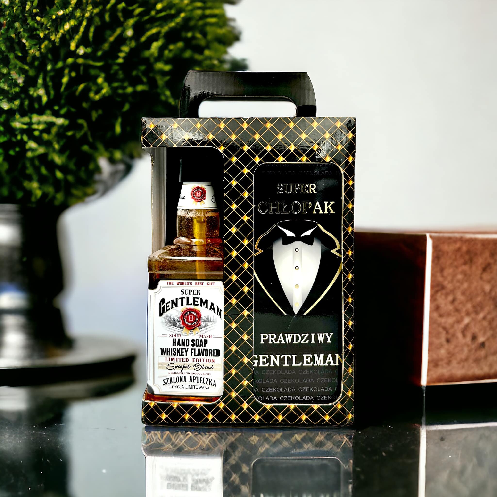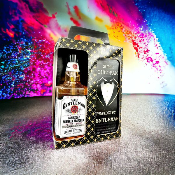Mydło Whiskey plus mleczna czekolada. Złocone etykiety zarówno na mydle , jak i na czekoladzie.