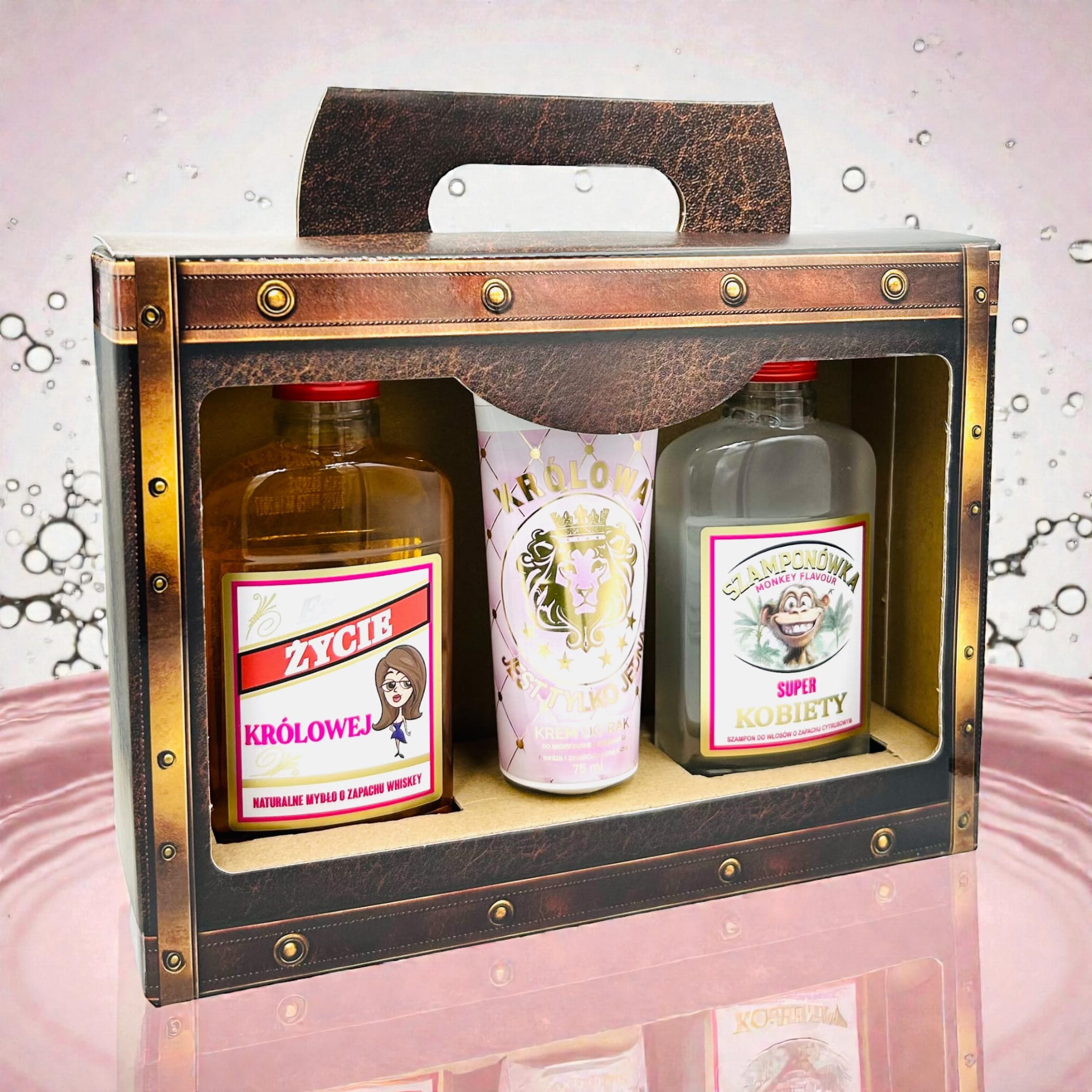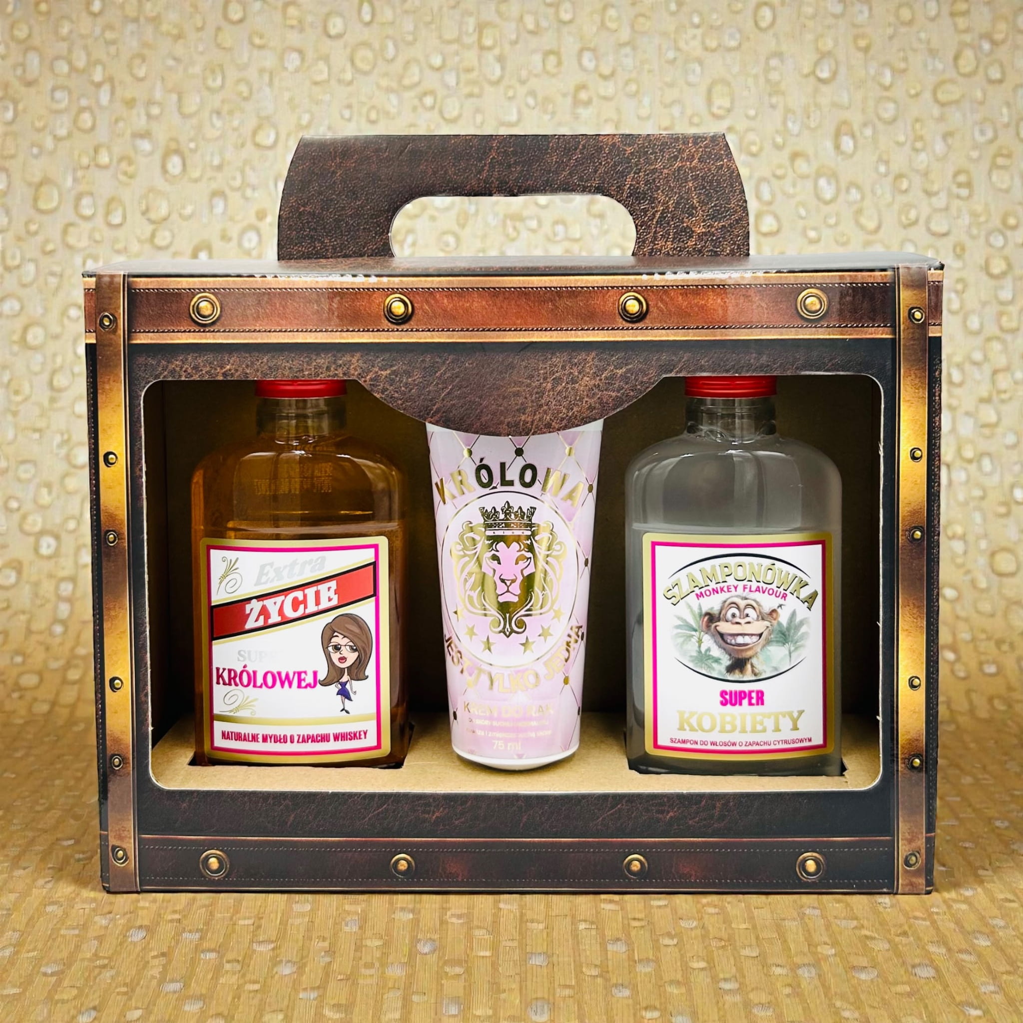 W środku walizki kryją się trzy miniaturowe perełki: mydło w płynie, szampon oraz krem do rąk. Zapakowane są w ikoniczne, buteleczki typu „małpka", znane z półek sklepowych , oraz praktyczną tubkę. To hołd dla klasyki w nowej, praktycznej i luksusowej odsłonie. Ten wzór to absolutna nowość i prawdziwy rarytas niedostępny dotąd na rynku.